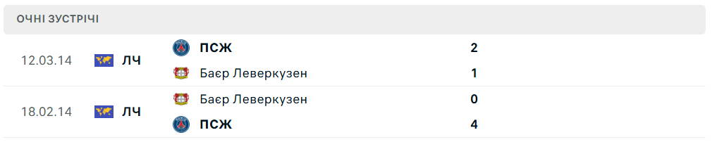 Баєр та Парі Сен-Жермен вже перетинались в Лізі чемпіонів — це сталося у 2014 році в рамках 1/8 фіналу. Тоді парижани двічі перемогли: на виїзді завдяки дублю Ібрагімовича та голам Матюїді й Кабая, а вдома — після точних ударів Маркіньйоса й Лавессі (2:1).